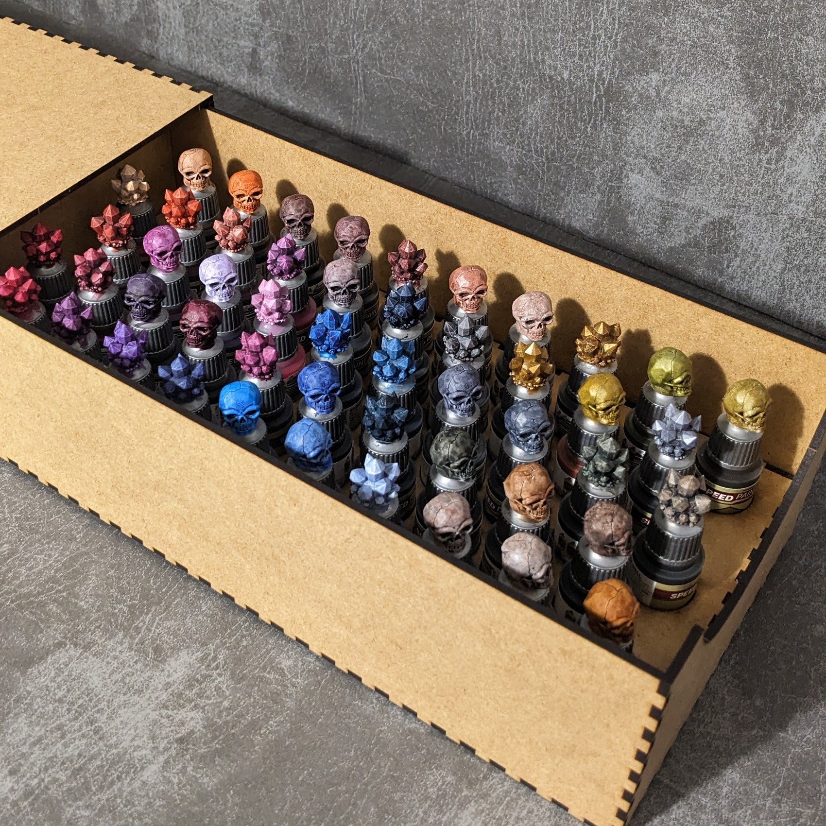 These 3D printed paint bottle toppers are designed to fit standard sized paint dropper bottles, shown here with Army Painter Speed Paints. Please note, the updated design for Vallejo paint bottles have larger lids that do not fit these toppers, but original Vallejo paint bottles fit well. When painted, these toppers provide an accurate swatch of your colour, reducing annoying bottle mix-ups and surprising speed paint outcomes. These toppers also upgrade the look of your bottles, making a rainbow of coloured toppers for you to display.